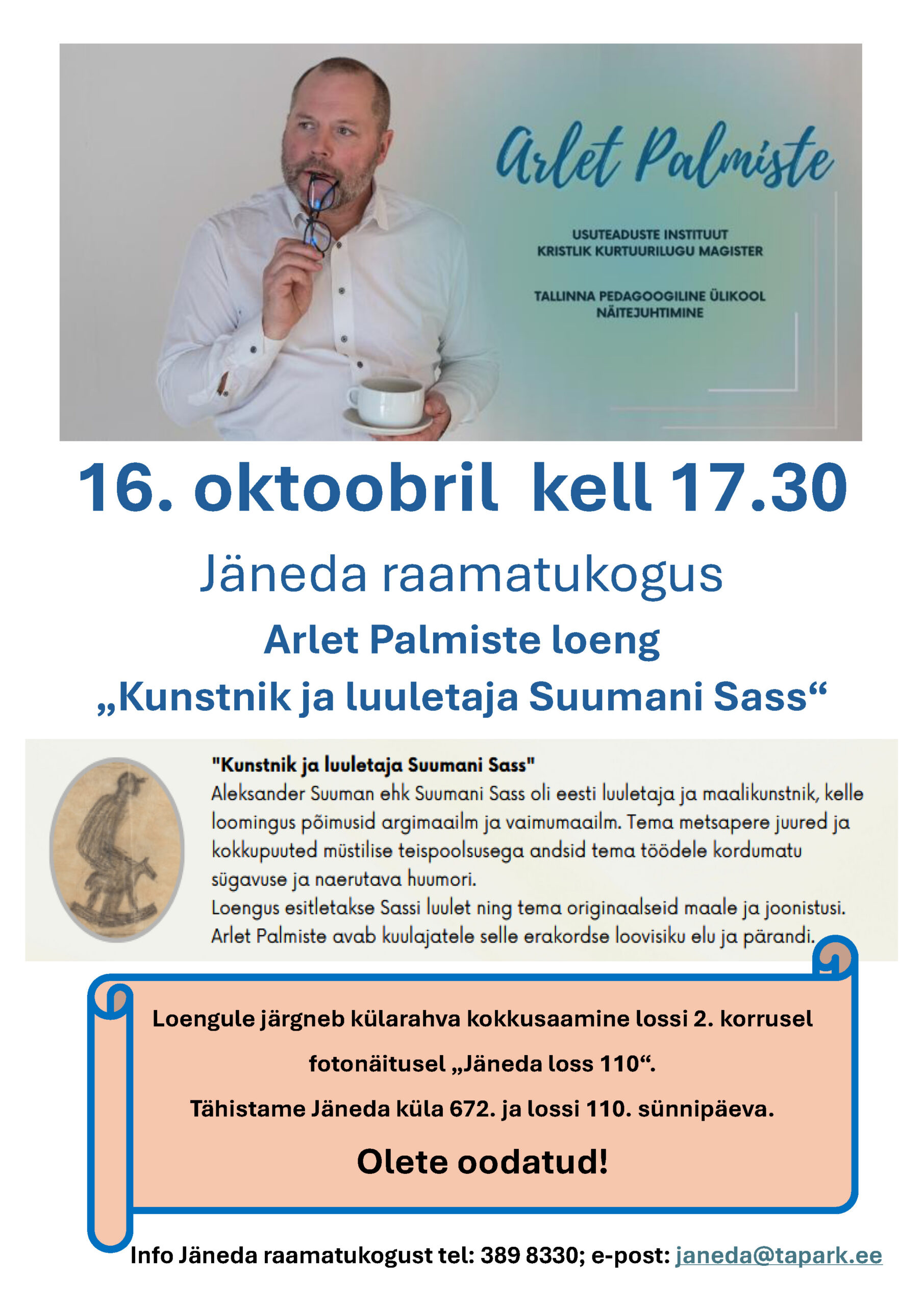 16. oktoobril 2025. a kell 17.30 Jäneda raamatukogus Arlet Palmiste loeng „Kunstnik ja luuletaja Suumani Sass“.