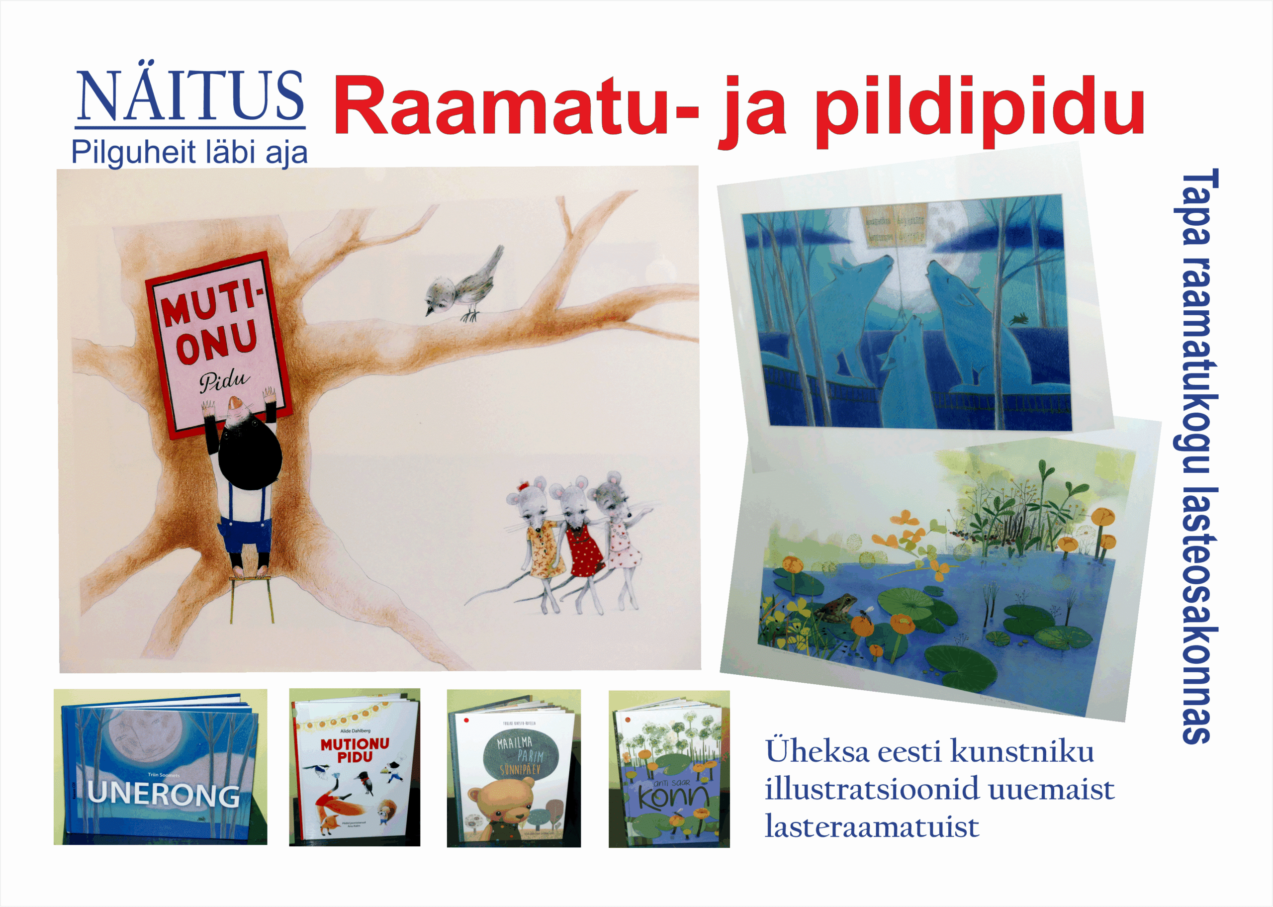 Näitus köidab meid mõnusate värviliste ja meeleolukate piltidega. Väljas on üheksa eesti kunstniku illustratsioonid uuematest lasteraamatutest. Kauem eesti lasteraamatuid illustreerinud kunstnikest on esindatud Regina Lukk-Toompere – esimene Edgar Valteri illustraatoripreemia laureaat. Ka eesti lastekirjanduse keskuse Muhvi auhinna pälvinud graafiku Viive Noore looming on esindatud. Enamik autoreist on aga noorema põlvkonna illustraatorid.