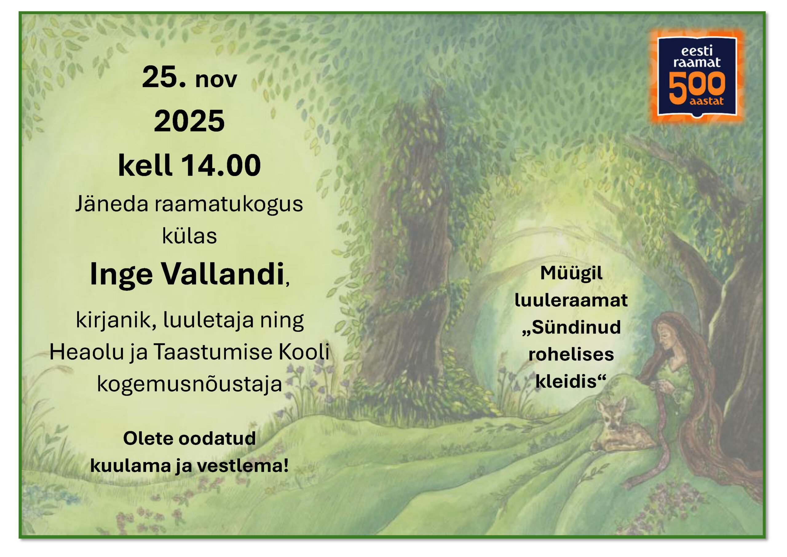 25. novembril 2025. a kell 14.00 on Jäneda raamatukogus külas Inge Vallandi — kirjanik, luuletaja ning Heaolu ja Taastumise Kooli kogemusnõustaja.